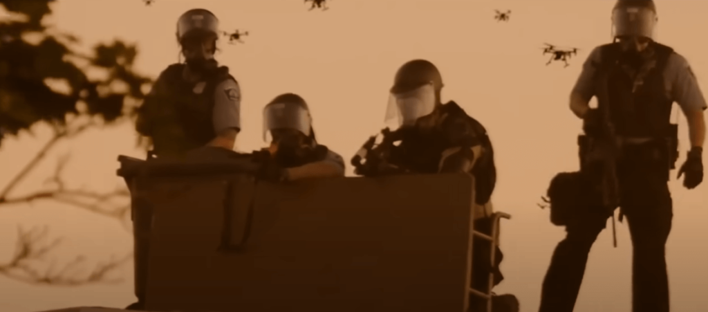 A distopia de 2073 não é só um cenário, mas quase um personagem. As escolhas visuais do filme — com céus laranja, ruas desertas e uma atmosfera gelada — dão vida ao futuro de uma forma impressionante e desconcertante. Essas imagens trazem uma reflexão sobre os perigos de uma sociedade cada vez mais vigiada e militarizada, algo que já vemos nos dias de hoje em várias partes do mundo.